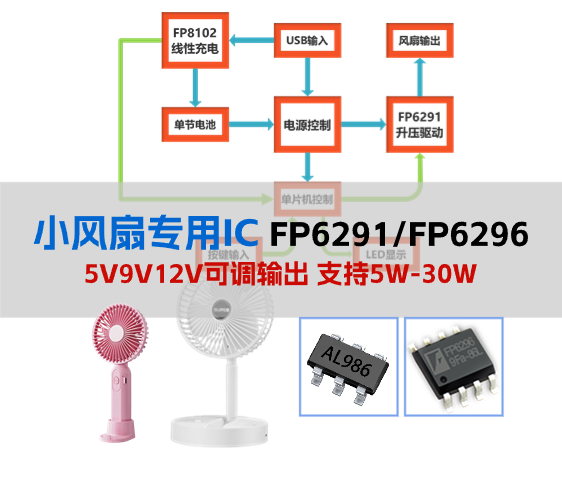 便携式小风扇采用远翔升压芯片FP6291/FP6296升压驱动电机转动,具有低噪音、高效能特点,可稳定供电并延长电池寿命。FP6291/FP6296适用于小风扇等升压电源需求领域,广泛应用于各种需升压电源的设备。¥ 0.00查看更多 →