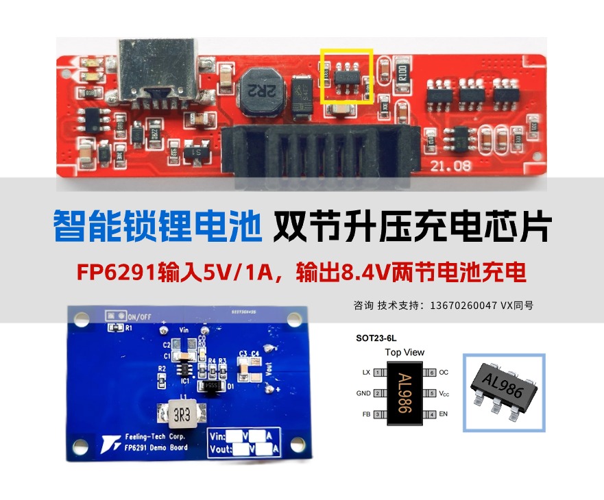 智能门锁电池双节升压充电芯片-FP6291支持5V1A输入升压 8.4V双节电池充电