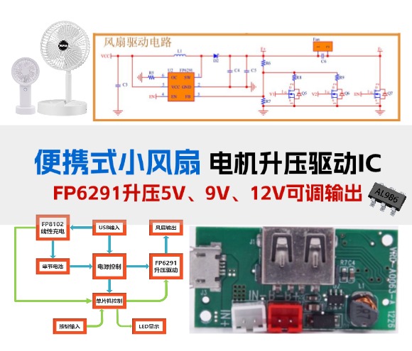 便携式风扇电机升压驱动IC,FP6291升压5V、9V、12V可调输出,可用于电池充电芯片